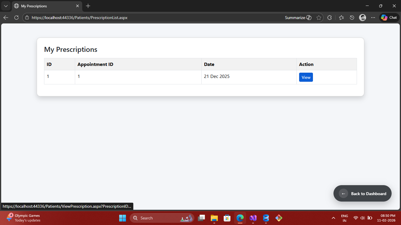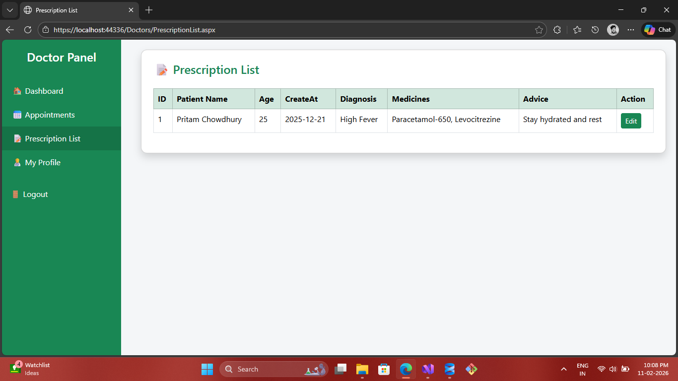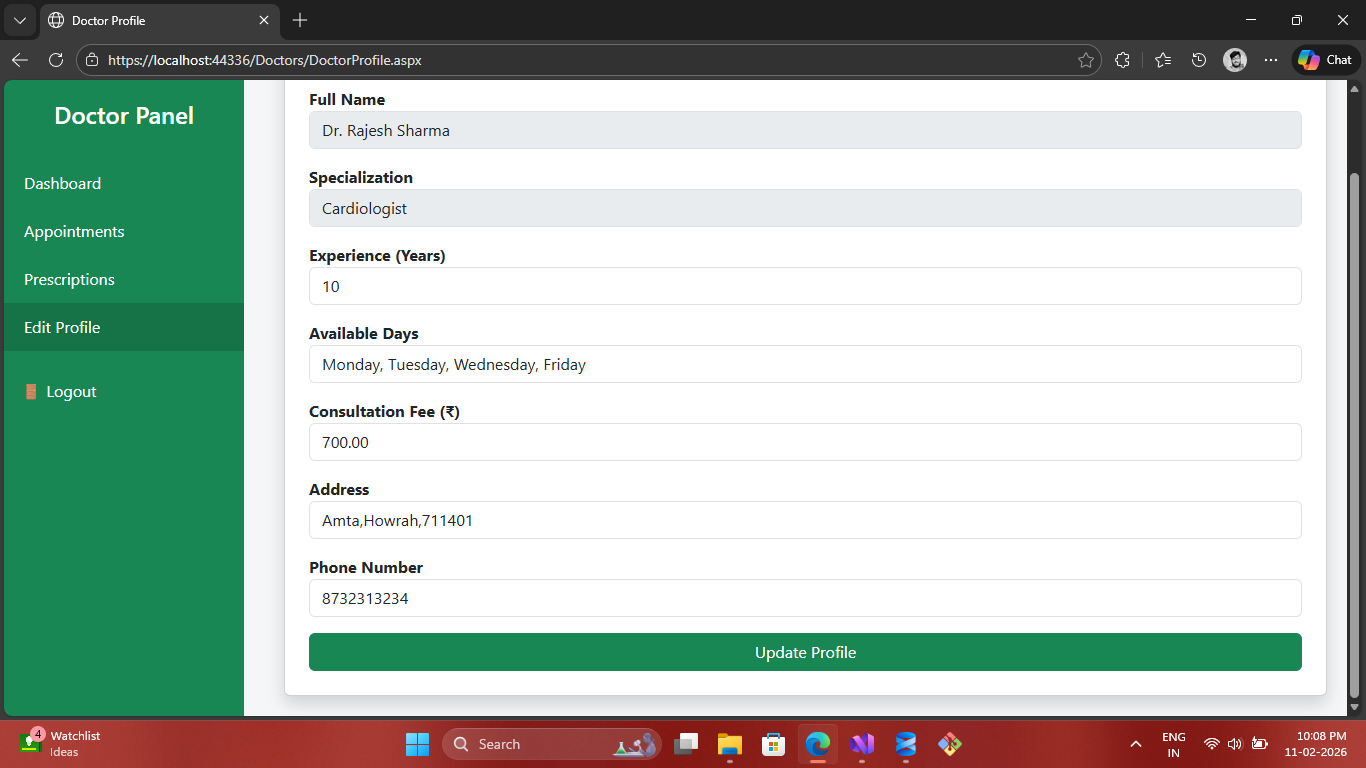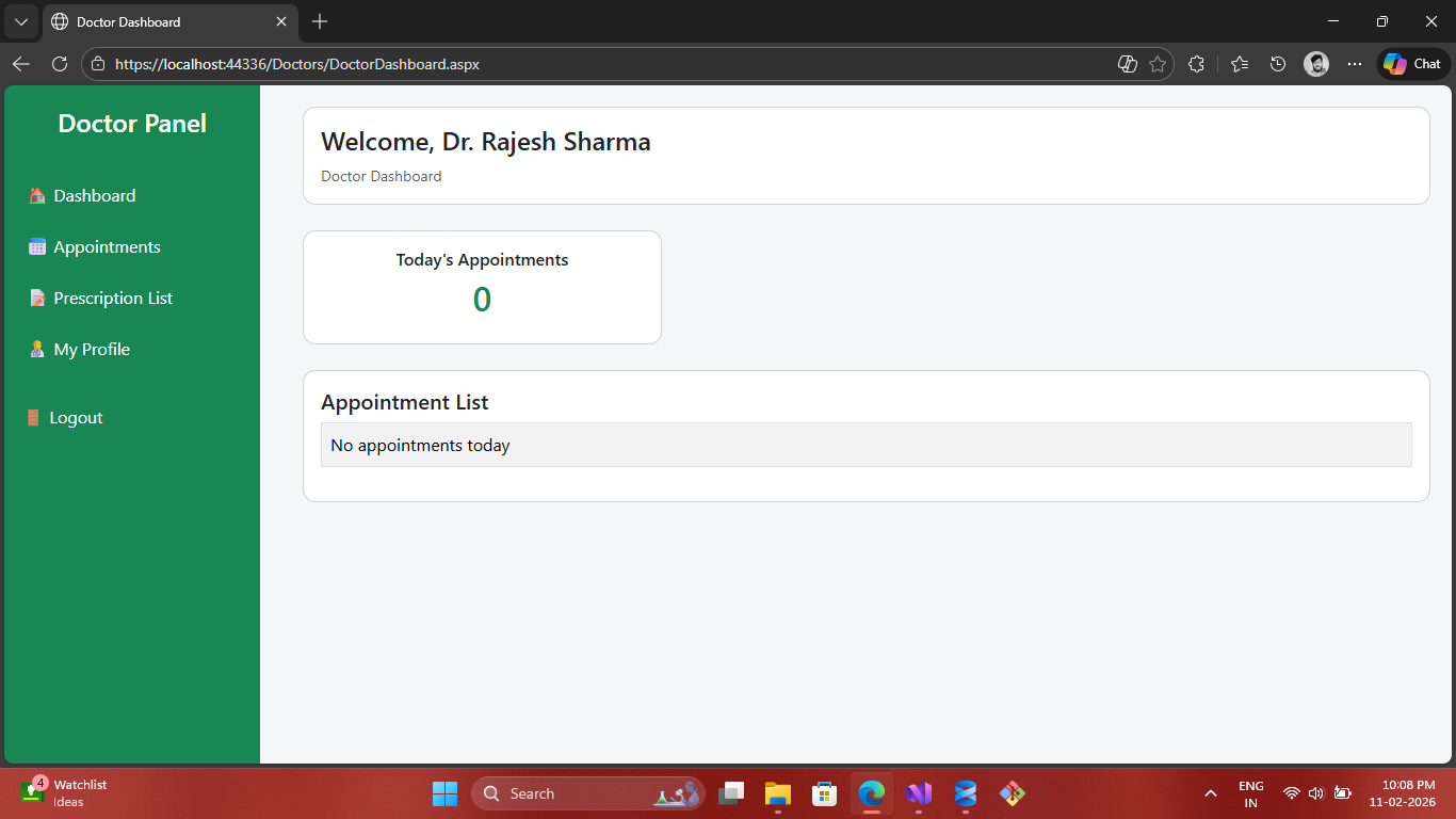 A role-based healthcare system built using ASP.NET Web Forms, C#, ADO.NET and SQL Server. Patients can book appointments and view prescriptions, while doctors manage schedules and medical records.