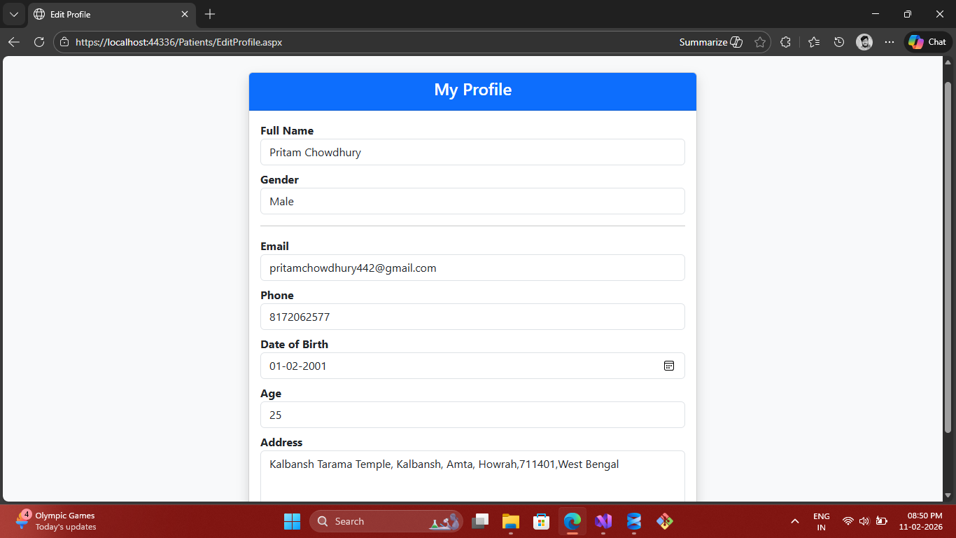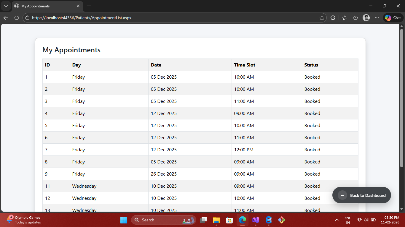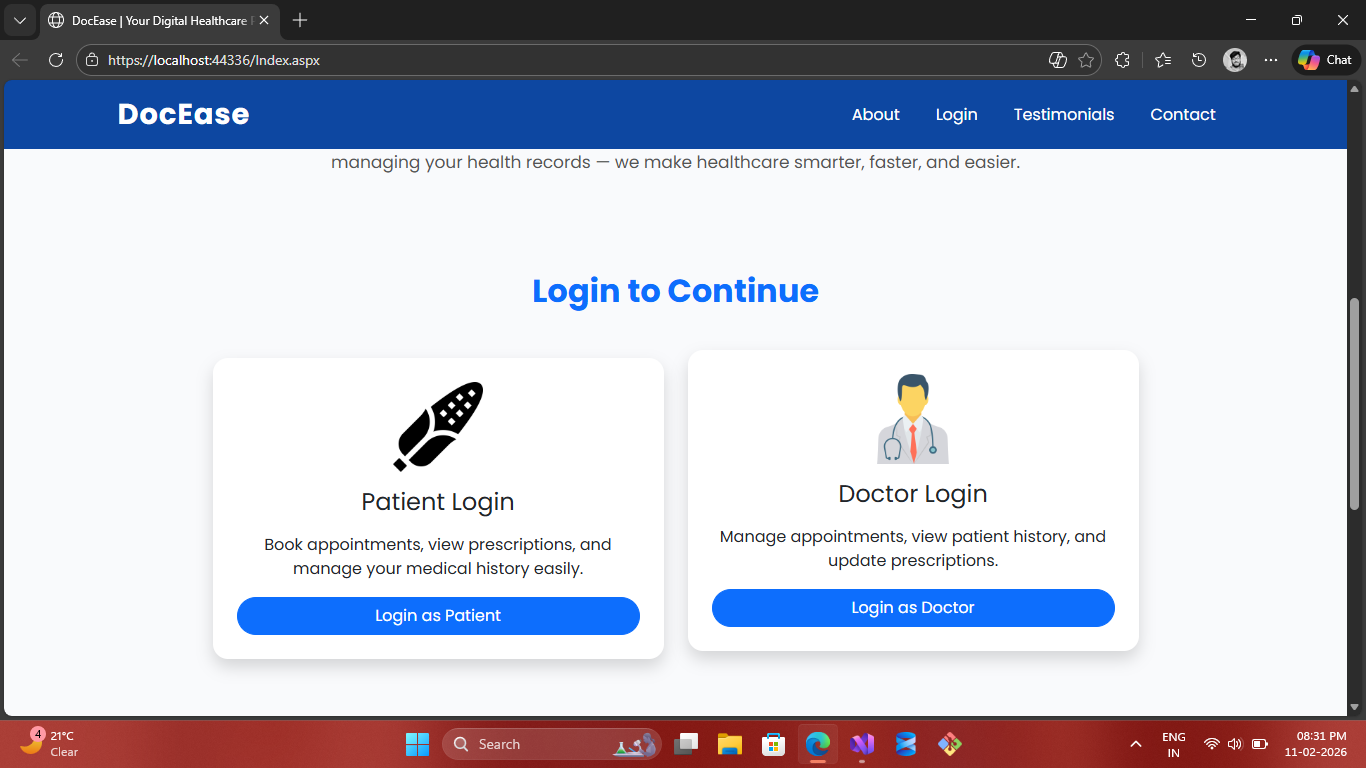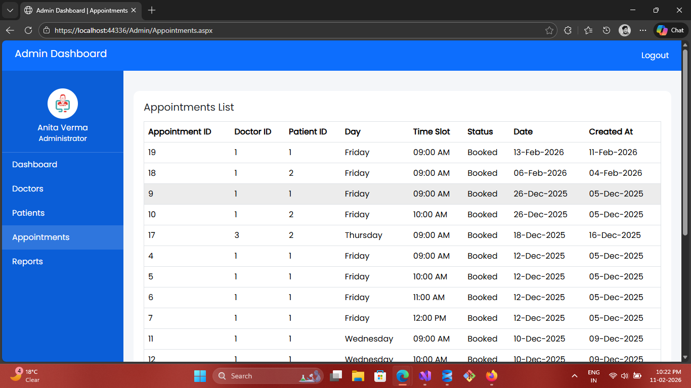 A role-based healthcare system built using ASP.NET Web Forms, C#, ADO.NET and SQL Server. Patients can book appointments and view prescriptions, while doctors manage schedules and medical records.